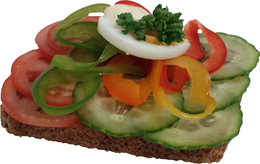 Schwarzbrotscheibe, Tomaten, Gurke, Paprika, Ei und Garnierung